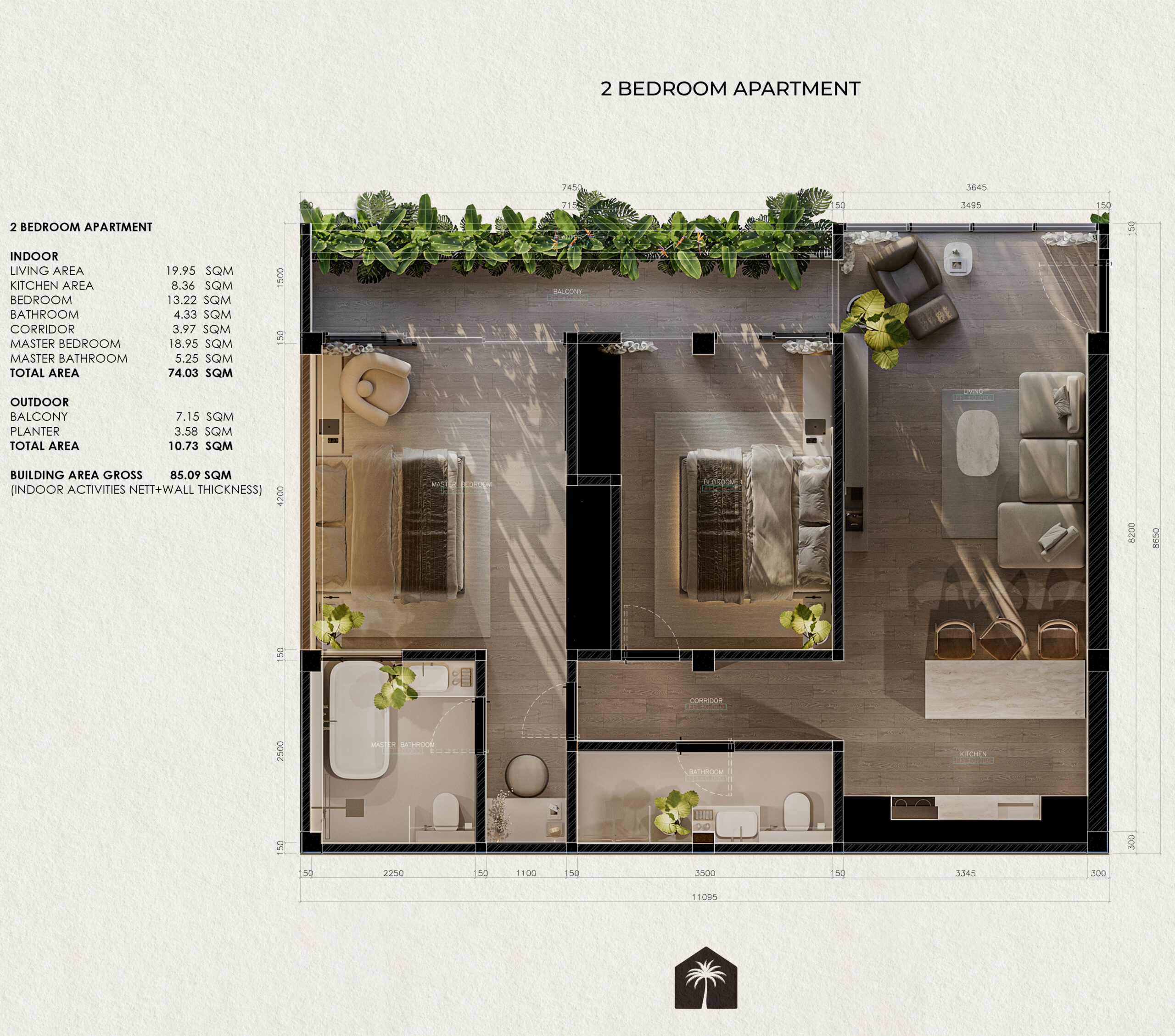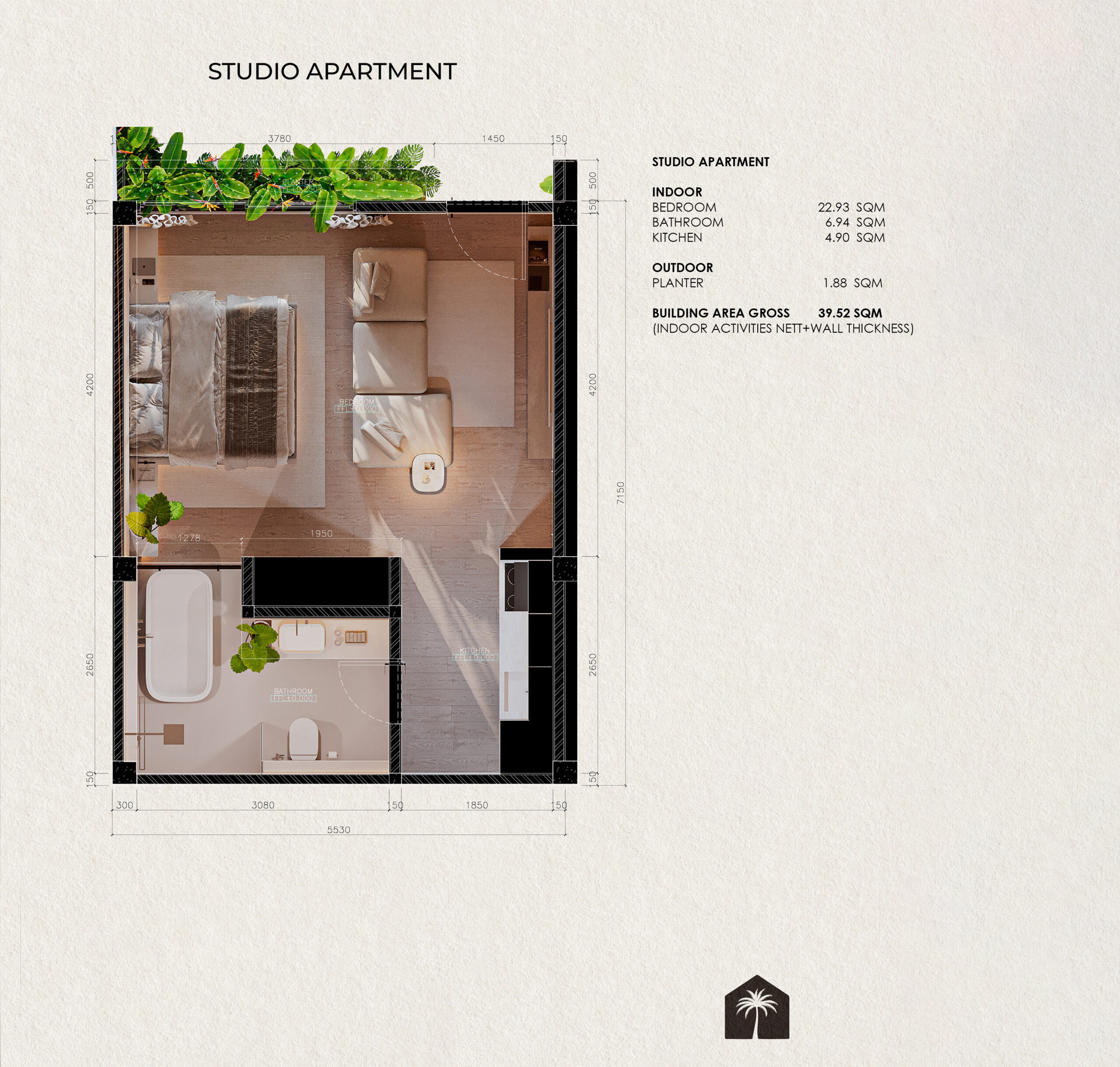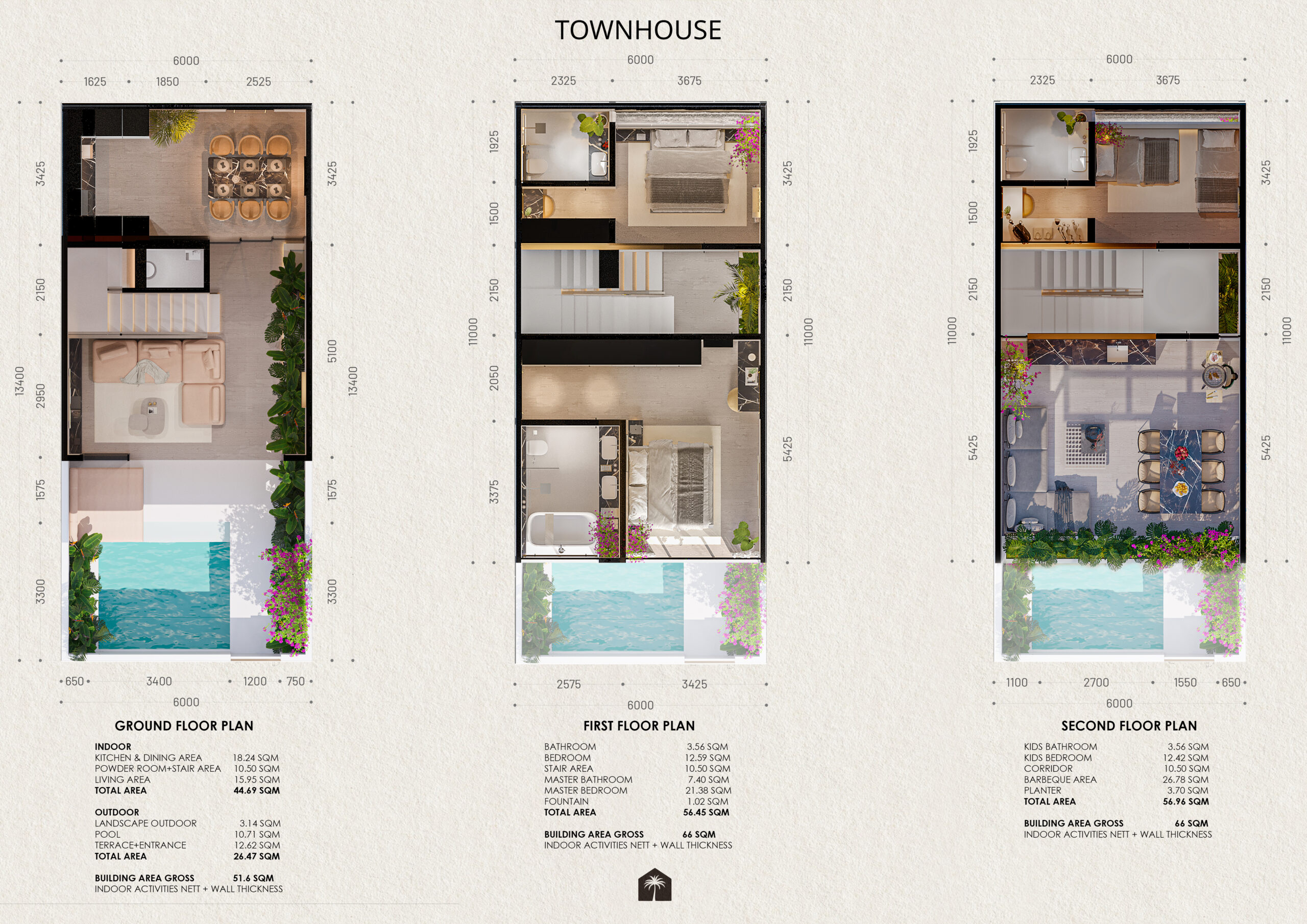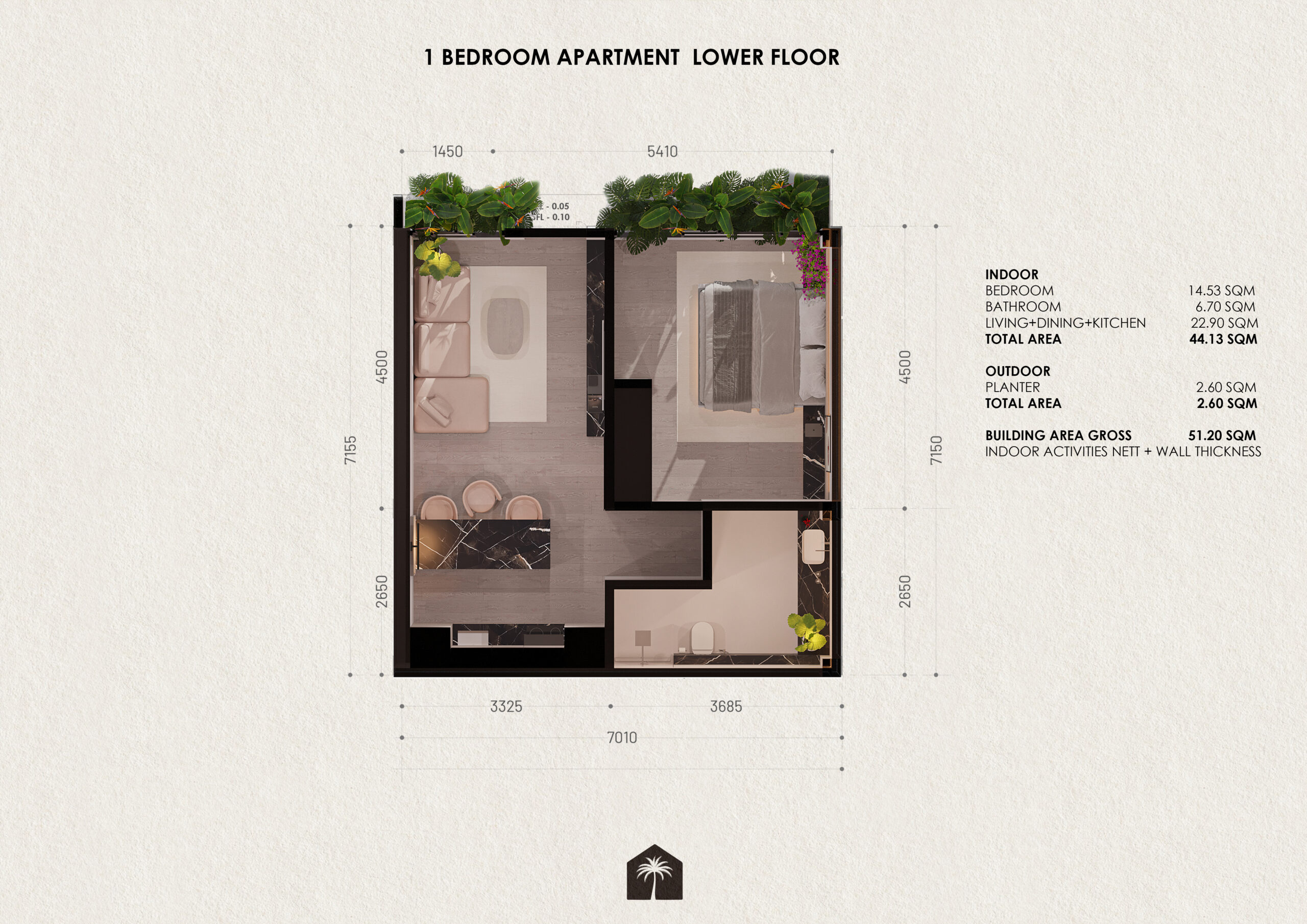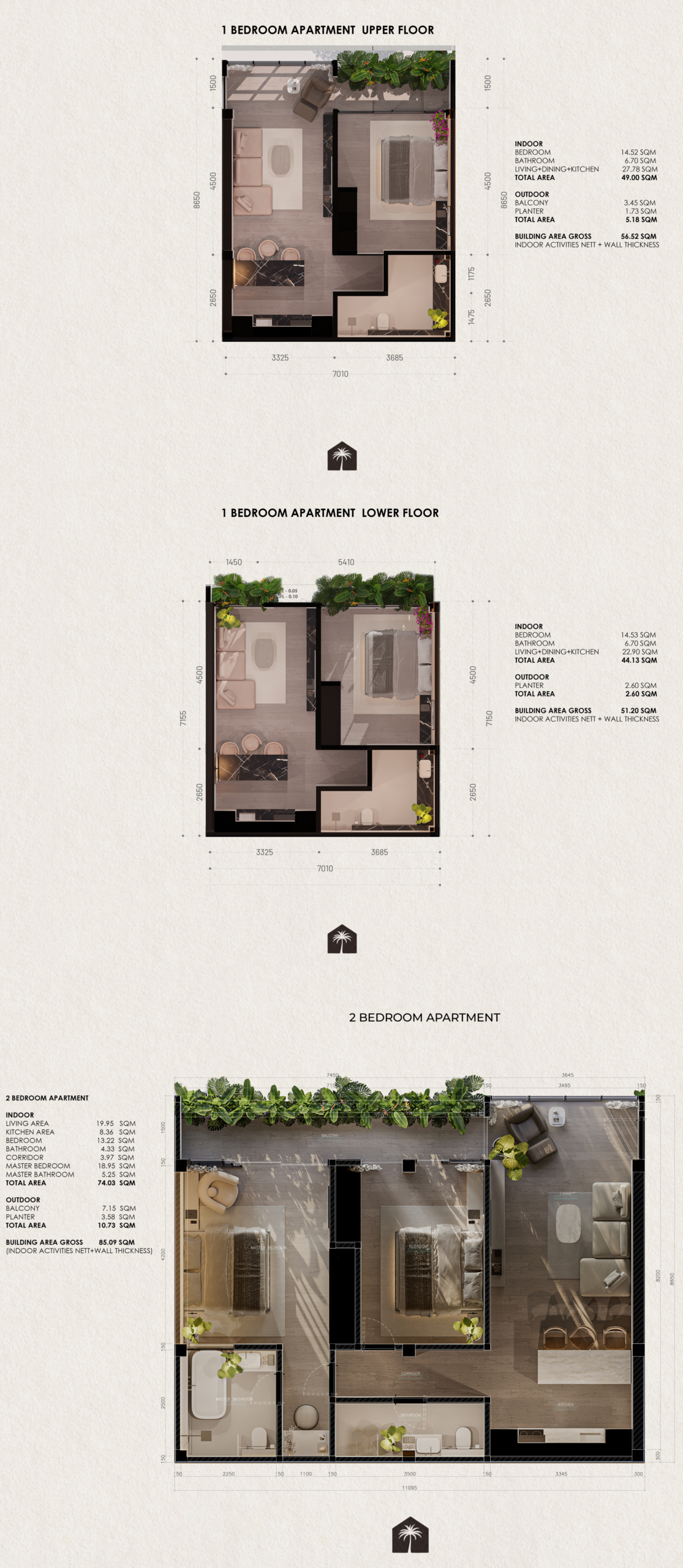 Setiap unit memiliki area ruang tamu, dapur, dan area luar privat yang terintegrasi secara mulus untuk pengalaman keseharian yang lebih optimal.